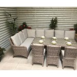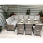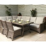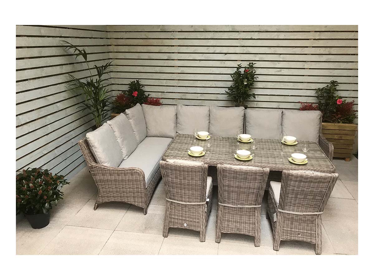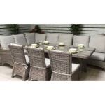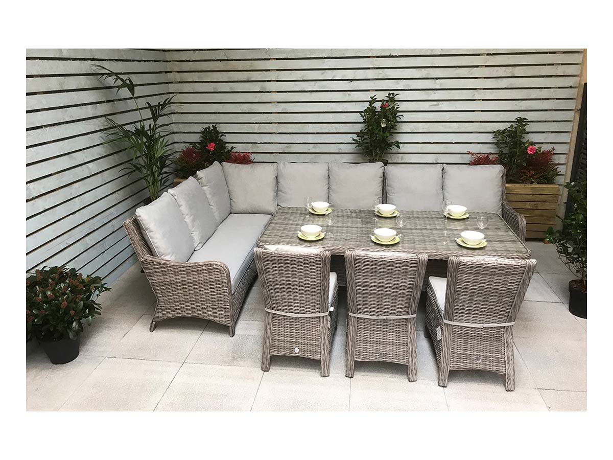 Signature Alexandra large high back corner dining group in fine grey wicker complimented with silver-grey cushions.